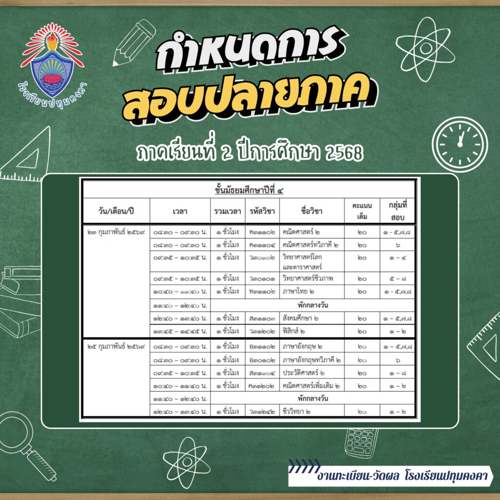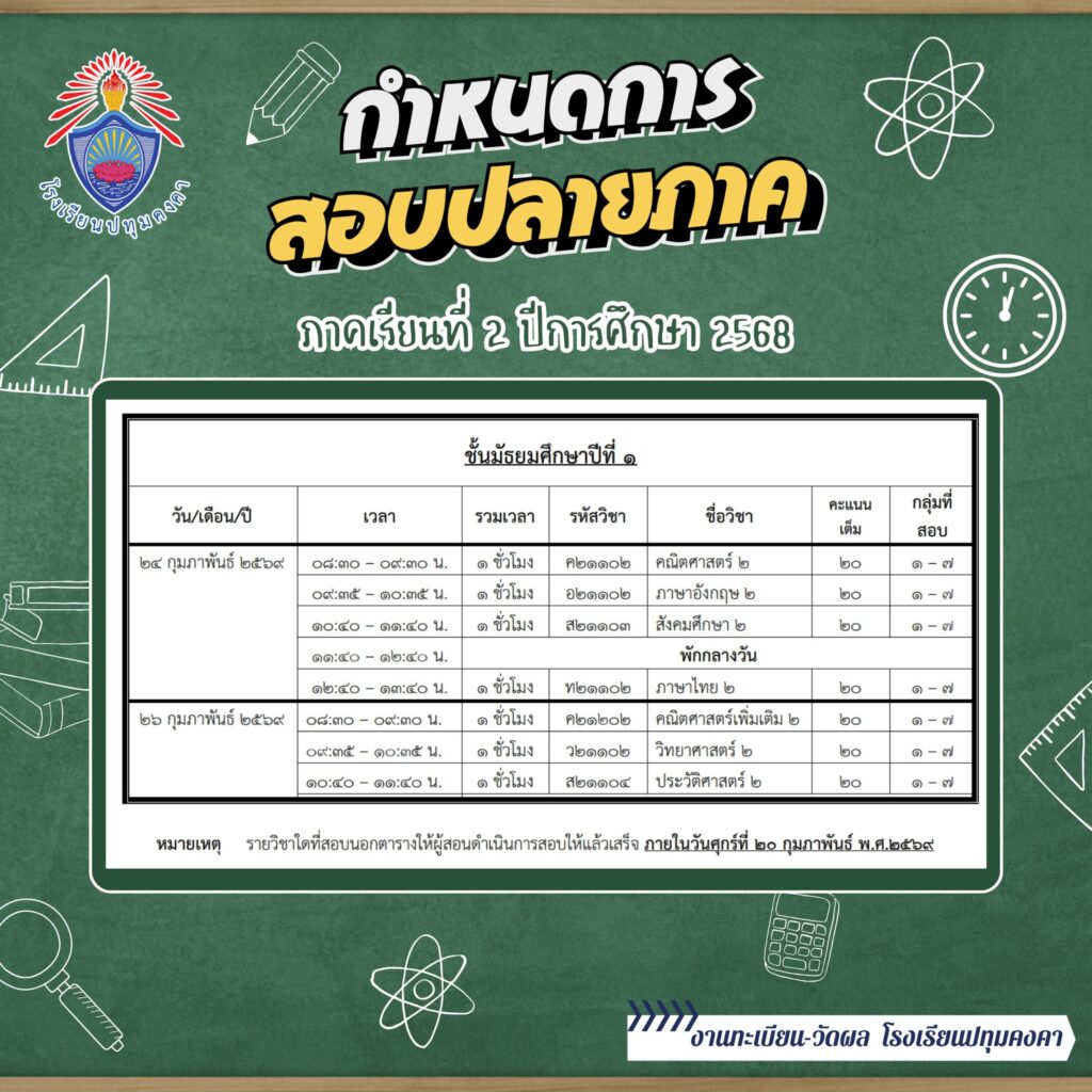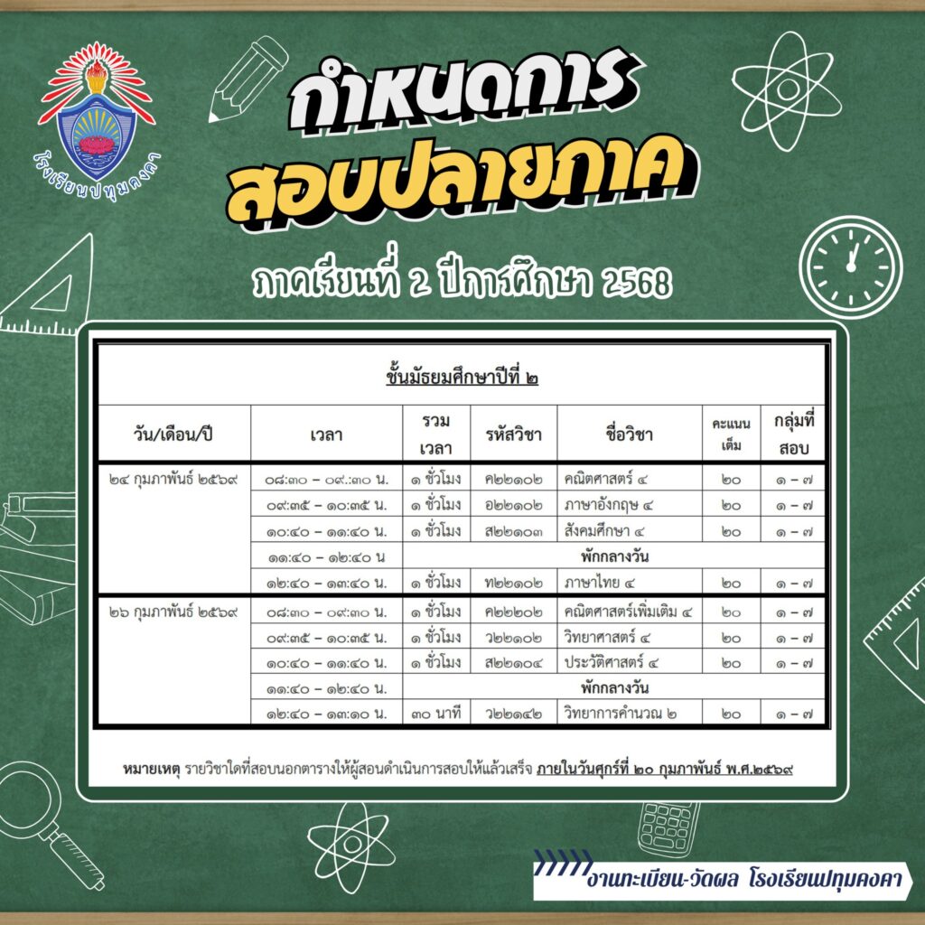 กำหนดการสอบปลายภาค ภาคเรียนที่ 2 ปีการศึกษา 2568 และกำหนดการ วันปิด-เปิด ภาคเรียน