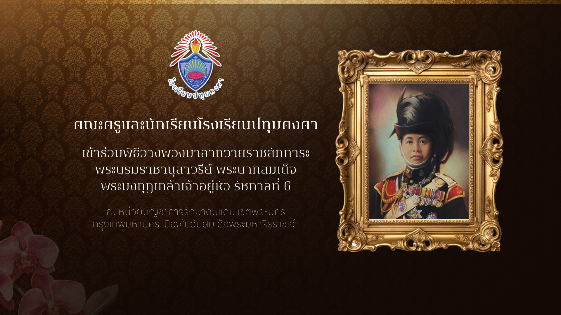 คณะครูและนักเรียนโรงเรียนปทุมคงคาเข้าร่วมพิธีวางพวงมาลาถวายราชสักการะ พระบรมราชานุสาวรีย์ พระบาทสมเด็จพระมงกุฎเกล้าเจ้าอยู่หัว รัชกาลที่ 6