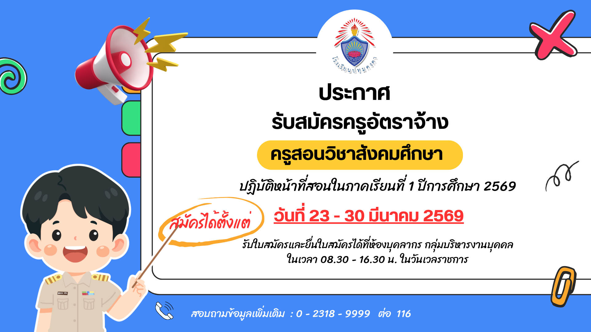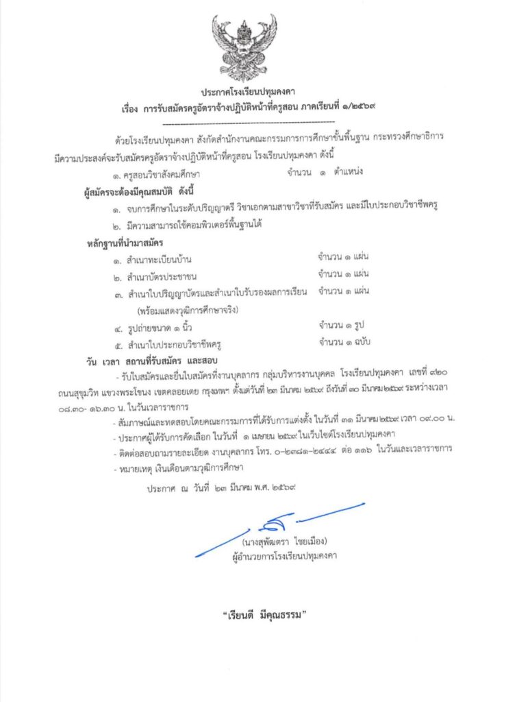 ประกาศ รับสมัครครูอัตราจ้างปฏิบัติหน้าที่ครูสอนวิชาสังคมศึกษา ภาคเรียนที่ 1/2569